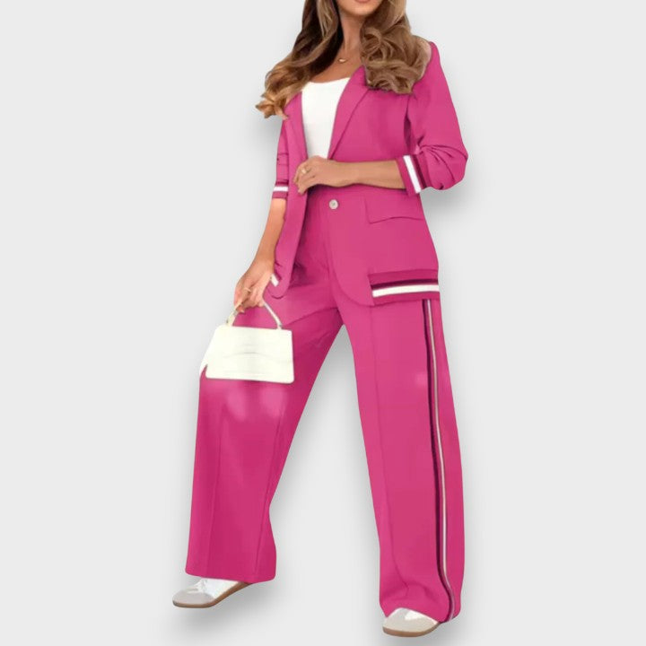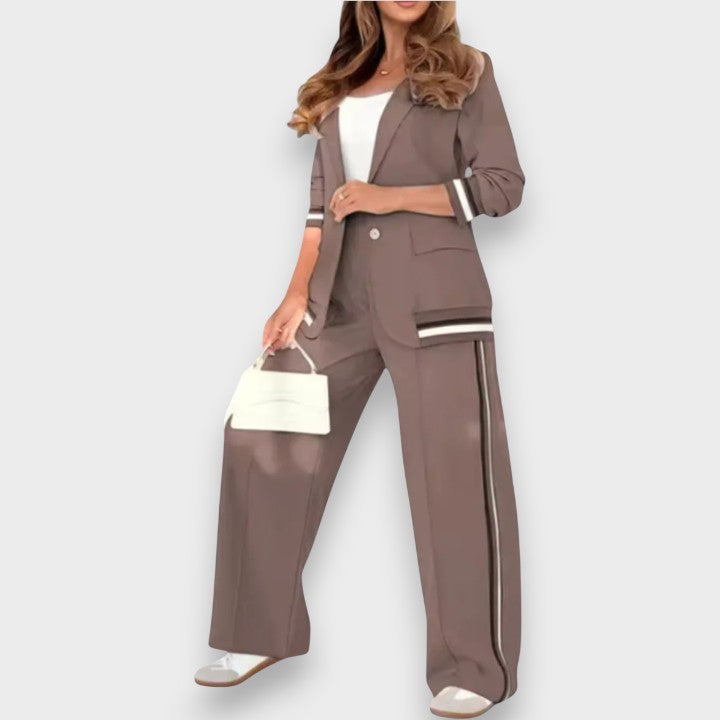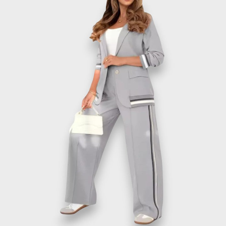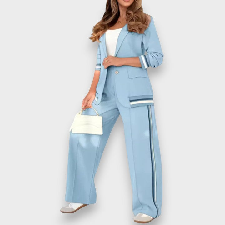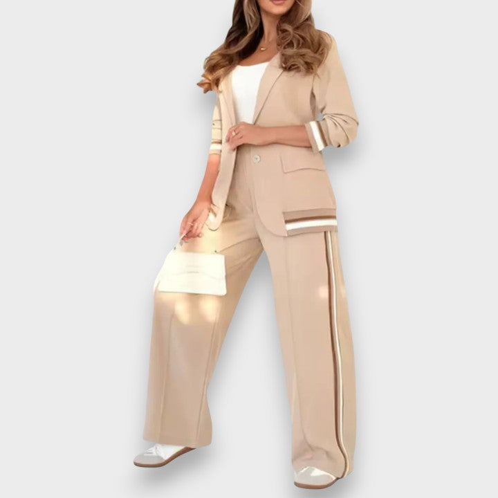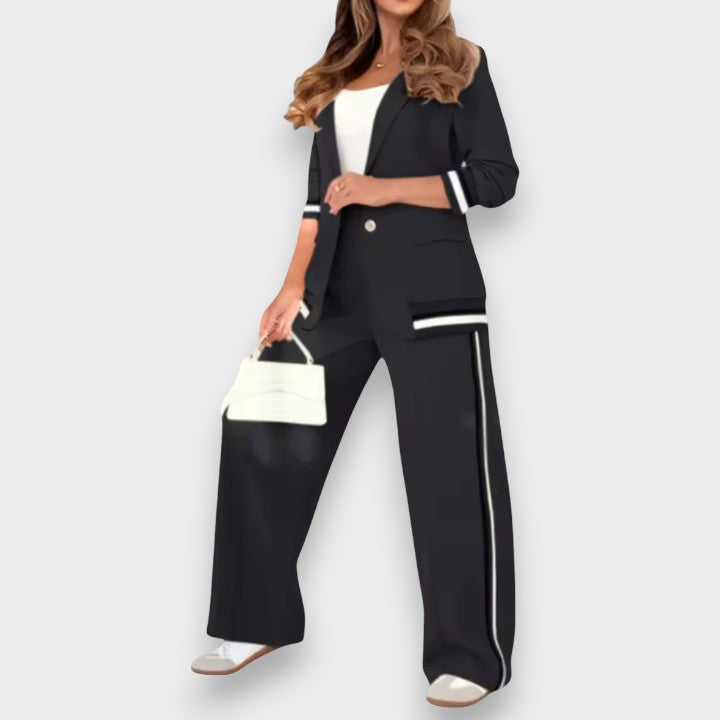 This modern two-piece combines business-class with urban chic. The slightly tailored blazer and the wide-cut trousers with contrasting striped details create a look that is both professional and relaxed. Ideal for women who exude style and confidence – whether in the office, at meetings, or after-work events.