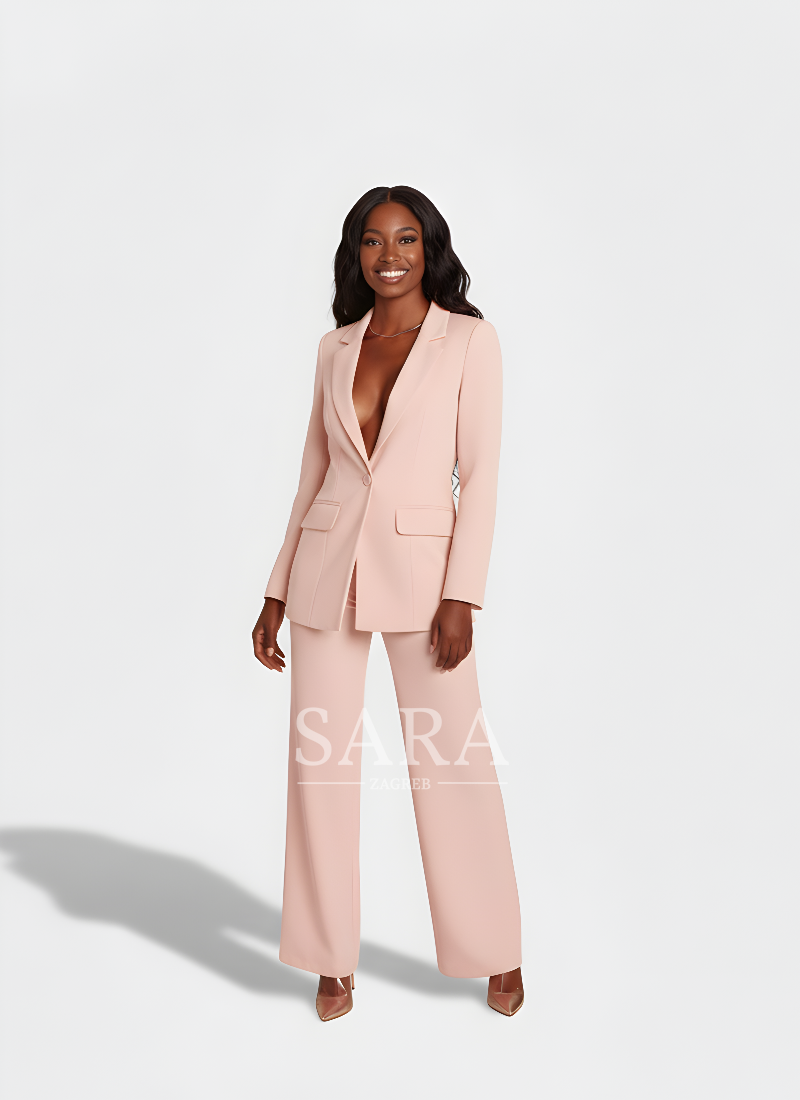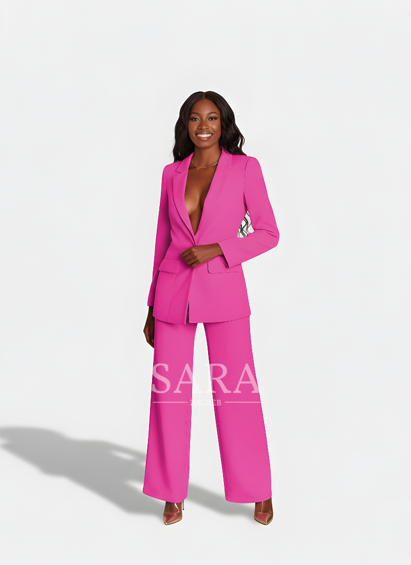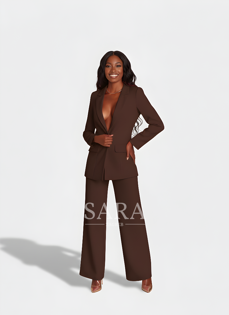 A women’s suit that combines sophistication with a modern attitude. The long blazer with peaked lapels, a single-button closure, and flap pockets beautifully defines the waist and visually elongates the figure. The straight-cut trousers with slightly wide legs and a pressed crease create a clean, lengthened silhouette while allowing freedom of movement. The fabric drapes elegantly, offering comfort from morning meetings to evening outings. Wear it as a complete set or style the pieces separately — equally powerful in the office, at events, or for a formal dinner.