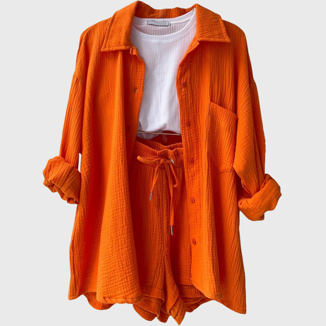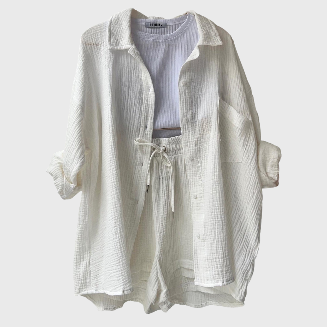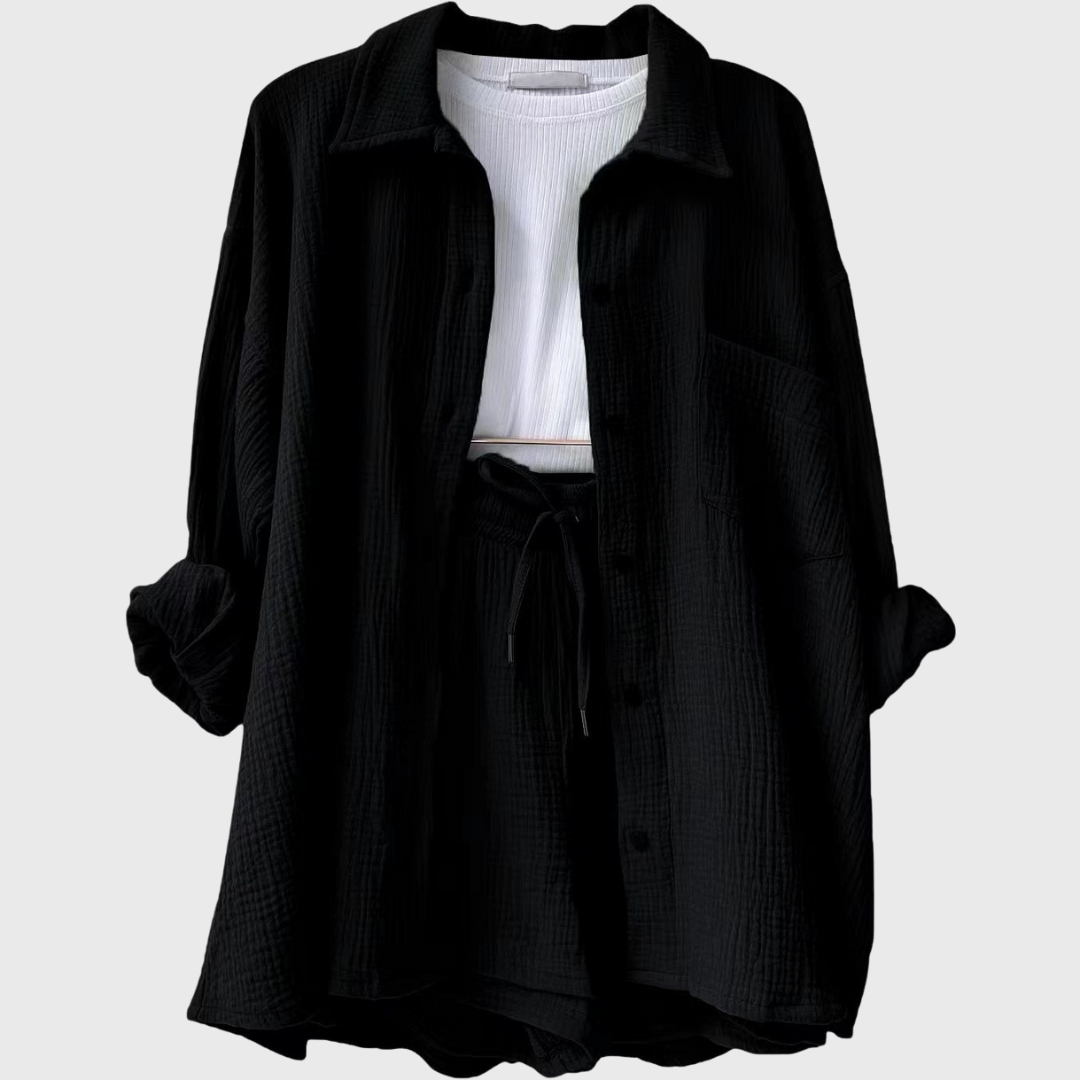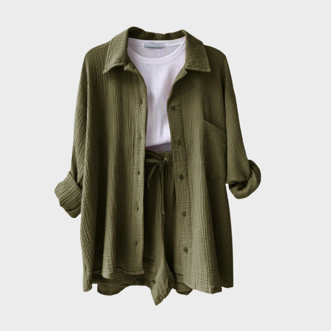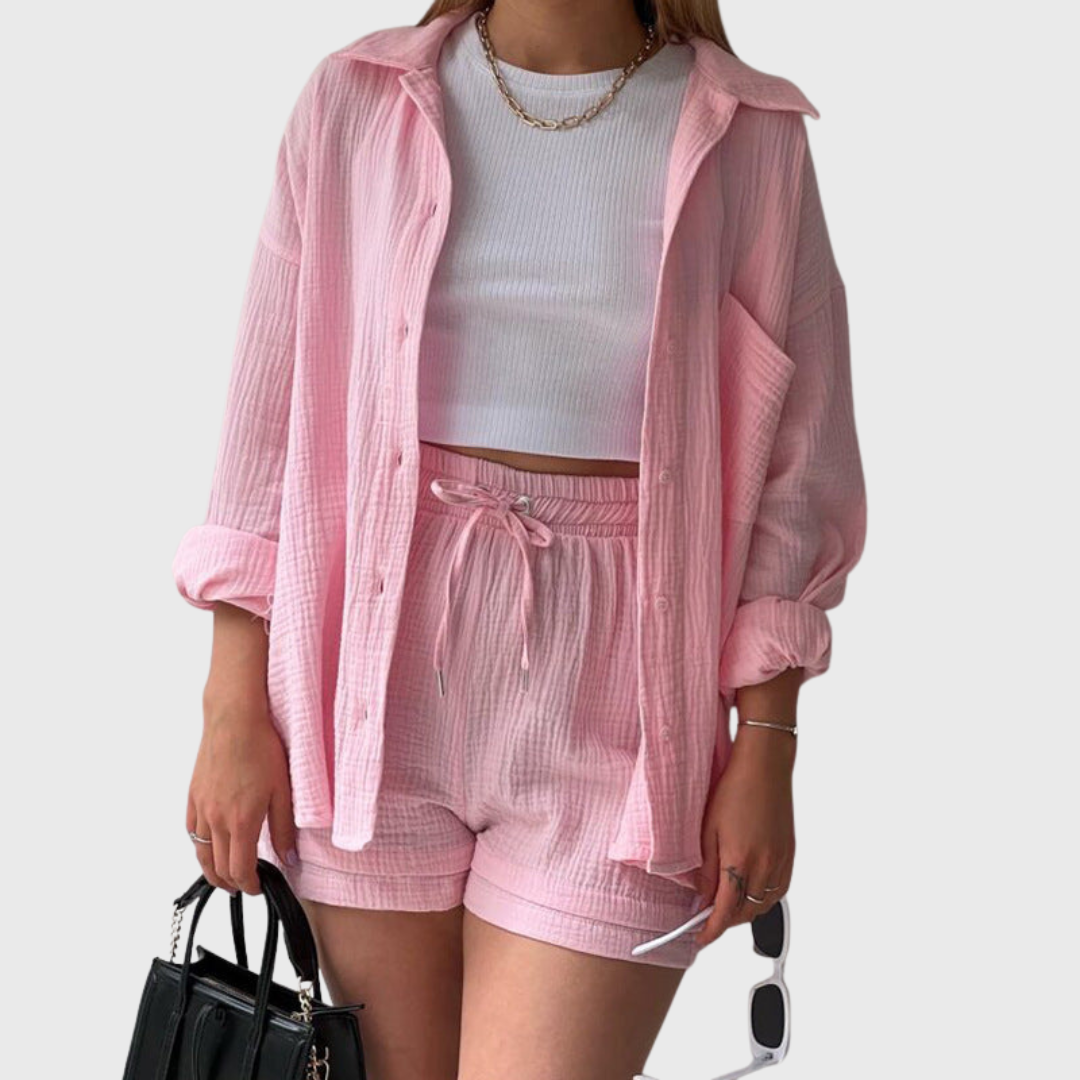This set represents effortless style with a modern twist. The loose oversized jacket and comfortable high-waisted shorts create a breezy, trendy look. Ideal for summer days, travel, or simply to be stylish and relaxed on the go.
